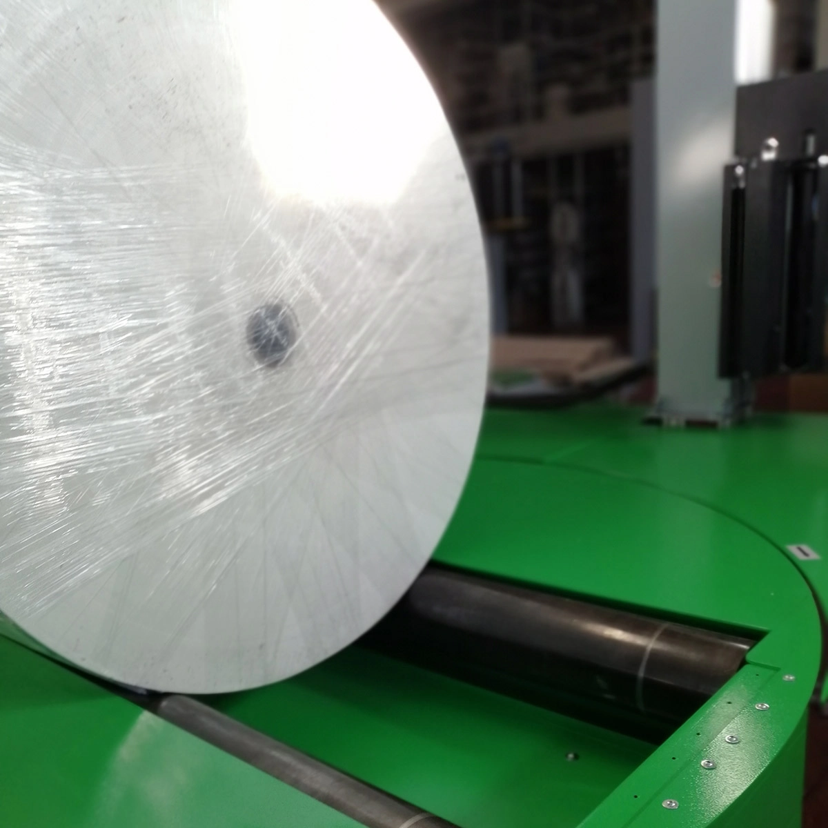 Macchina semi-automatica a tavola rotante per l’avvolgimento di bobine con film estensibile. Anche per bobine di grande formato.